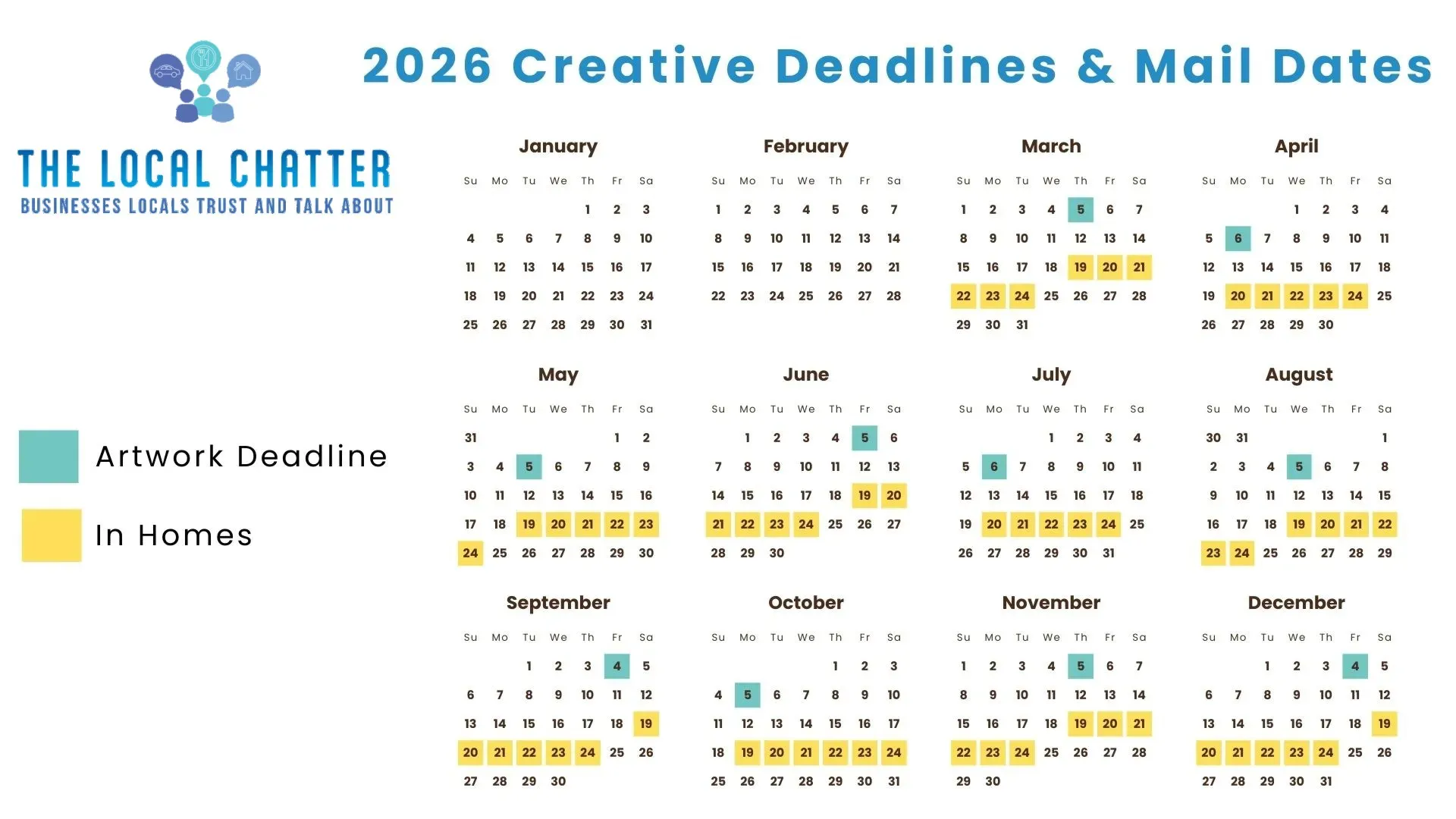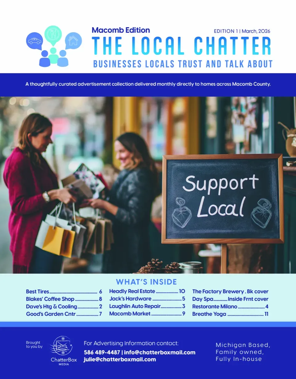 The Local Chatter is a professionally designed local publication mailed directly to homes throughout Macomb County. Each issue features a limited number of businesses per category and clearly defined delivery zones.